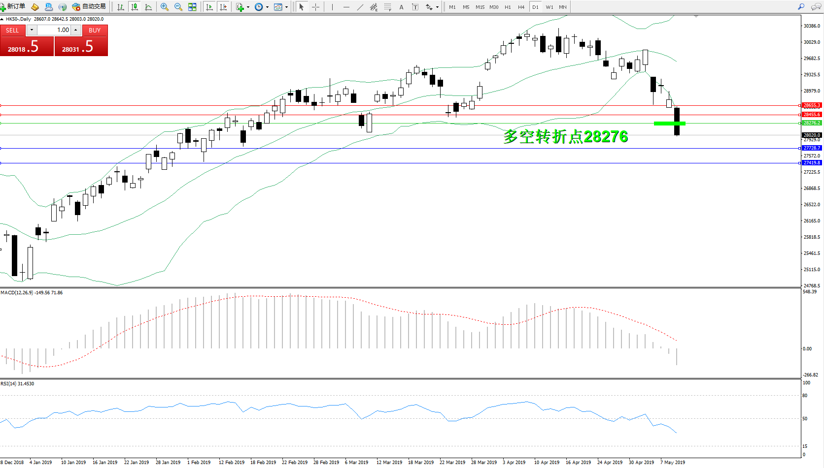 香港恒生指数收盘跌2.4%,报28311.07点,跌近700点,创两个月来新低。吉利汽车跌近6%领跌蓝筹,药明康德跌近8%,中金公司跌5.2%。内地沪深股市早上低开,后公布数据稍见理想。上证跌幅收窄。深证及创业板更曾经反弹倒升。唯弱势持续,再度回落,并扩大跌幅至收市。4月份全国居民消费价格指数 CPI 按年上升2.5%,符预期及好过3月升2.3%。同时创出自201810月以来的高位。港股早上跟随外围弱势。 VIX 月内急剧上升,高见21.84,创出近月高位。指数反映投资者极度担心,对后市表现并不乐观。