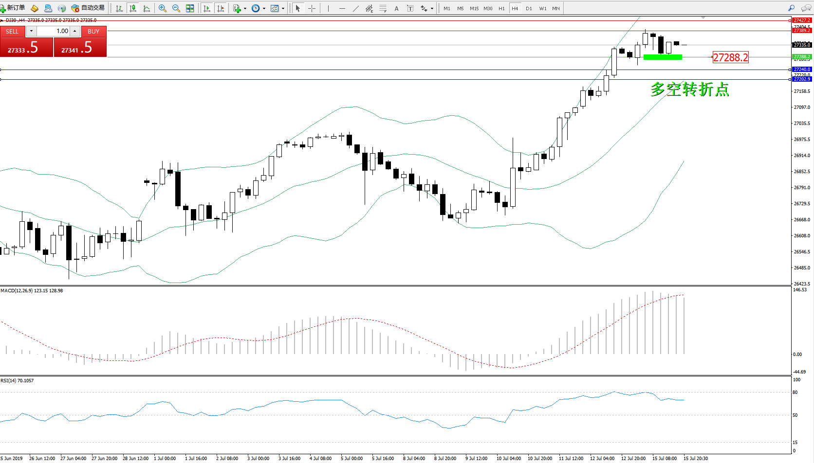 技术点评:持续多头延续布林带指标上轨上行后,高位短暂整理态势,多头动力有所减弱,布林带指标有收口迹象,MACD多头区域高位开始平移,RSI指标多头区域触及80均衡线后缓慢回撤维持整理中;