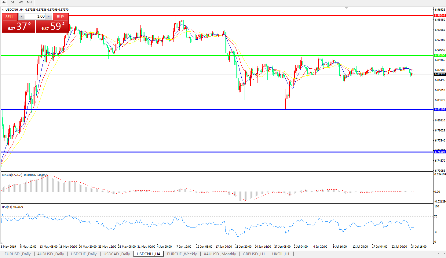 交易策略: 在6.9010之下,看跌,目标价位为6.8210,然后为6.7580。