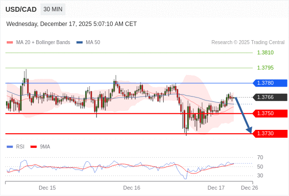 在 1.3780 之下,看跌,目标价位为 1.3750 ,然后为 1.3730 。