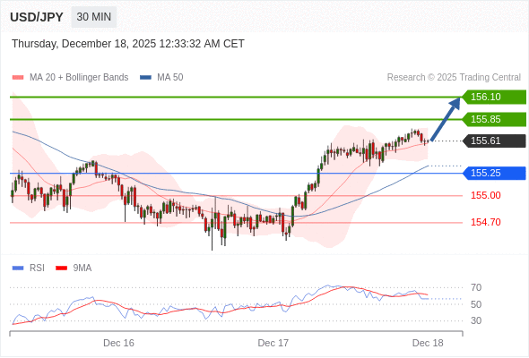 在 155.25 之上,看涨,目标价位为 155.85 ,然后为 156.10 。