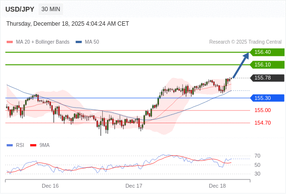 在 155.30 之上,看涨,目标价位为 156.10 ,然后为 156.40 。