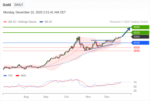 在 4160 之上,看涨,目标价位为 4500 ,然后为 4680 。