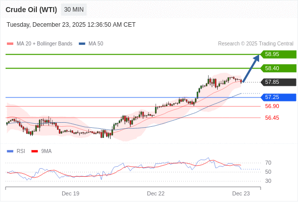 在 57.25 之上,看涨,目标价位为 58.40 ,然后为 58.95 。