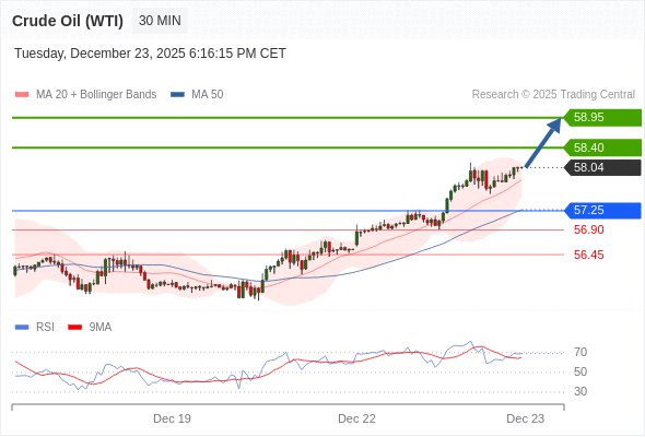 在 57.25 之上,看涨,目标价位为 58.40 ,然后为 58.95 。