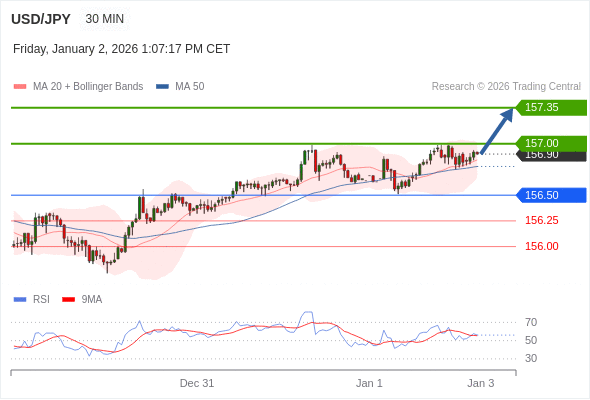 在 156.50 之上,看涨,目标价位为 157.00 ,然后为 157.35 。