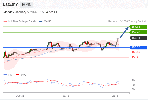 在 156.70 之上,看涨,目标价位为 157.40 ,然后为 157.65 。