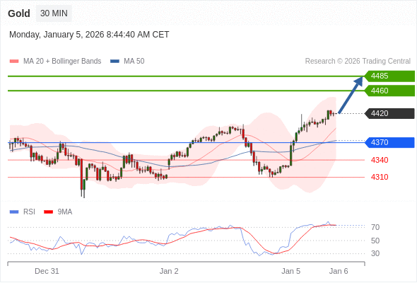 在 4370 之上,看涨,目标价位为 4460 ,然后为 4485 。