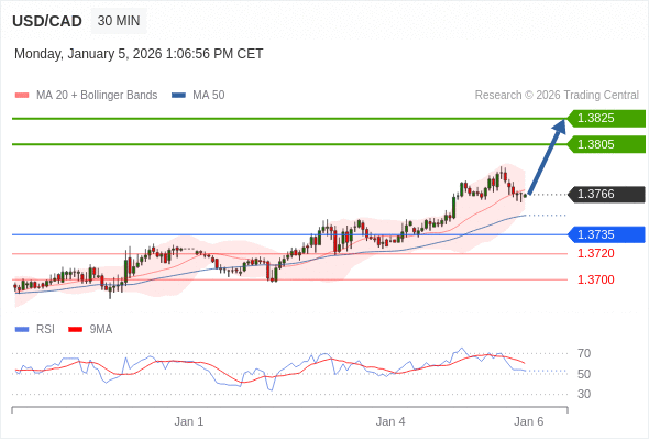 在 1.3735 之上,看涨,目标价位为 1.3805 ,然后为 1.3825 。