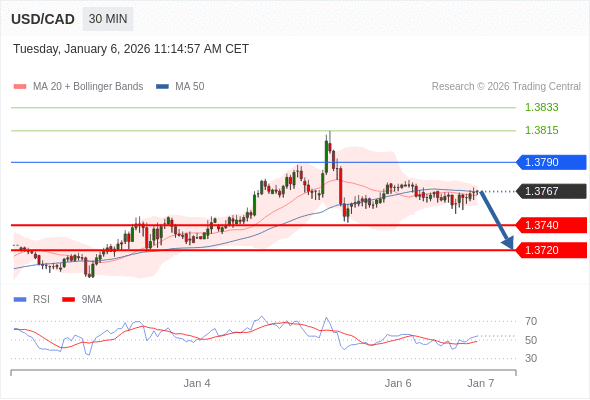 美元/加元 当日内: 短期关键阻力位在1.3790。