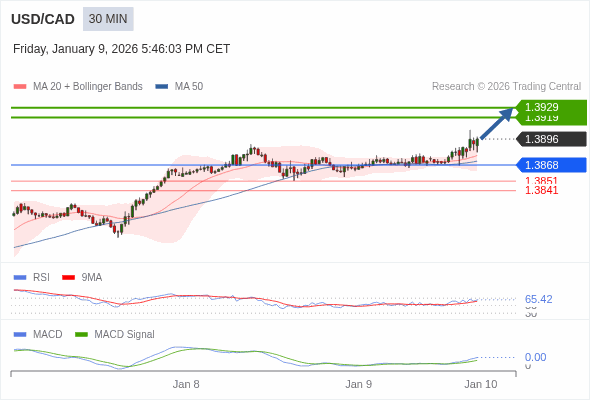 美元/加元 当日内 : 看涨,当 1.3868 为支撑位。