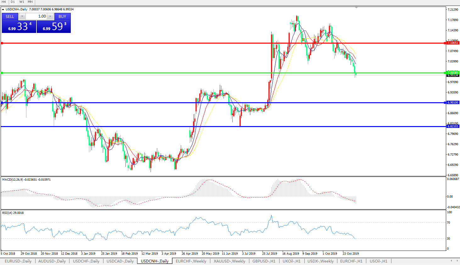 交易策略: 在7.0000之下,看跌,目标价位为6.9010,然后为6.8210。