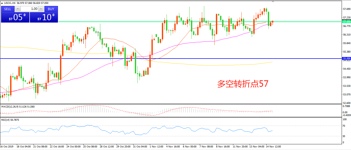4小时图看,油价延续震荡上行,57.5成为上方阻力,均线系统成为下方支撑,MACD红柱增加,RSI指标拐头向上,日内上行概率较大。