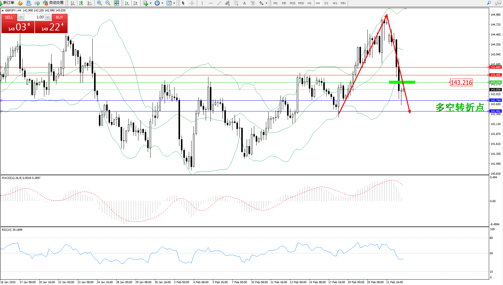 备选策略:143.216上方看涨,目标143.405、143.609