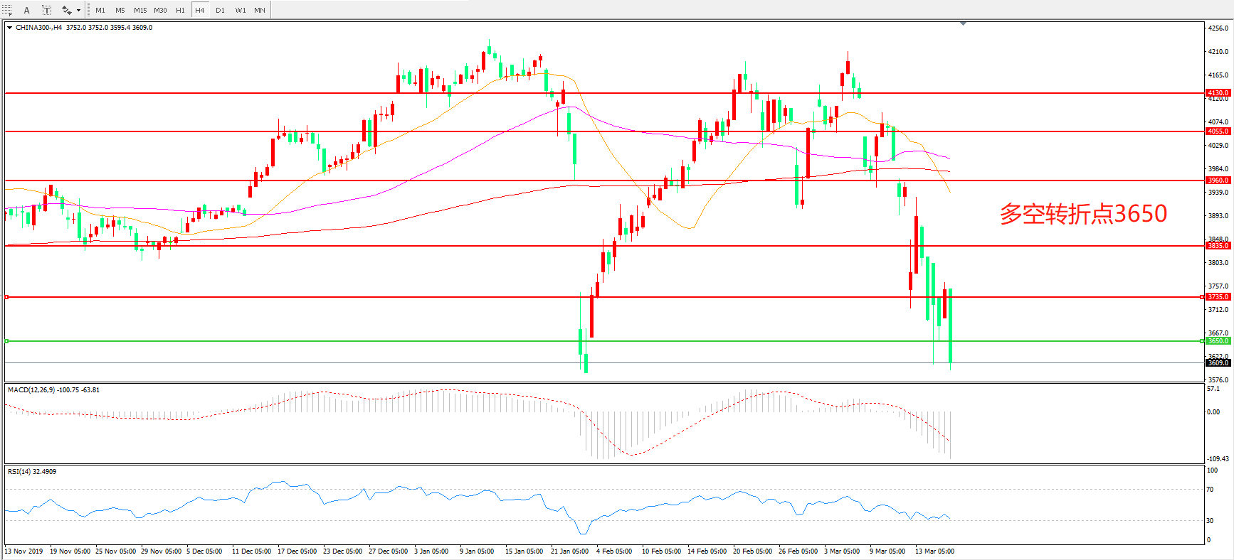 4小时图看,沪深300长阴下破,整体表现低迷,均线系统呈空头排列,MACD绿柱增加,RSI指标走平,日内延续下行概率较大。