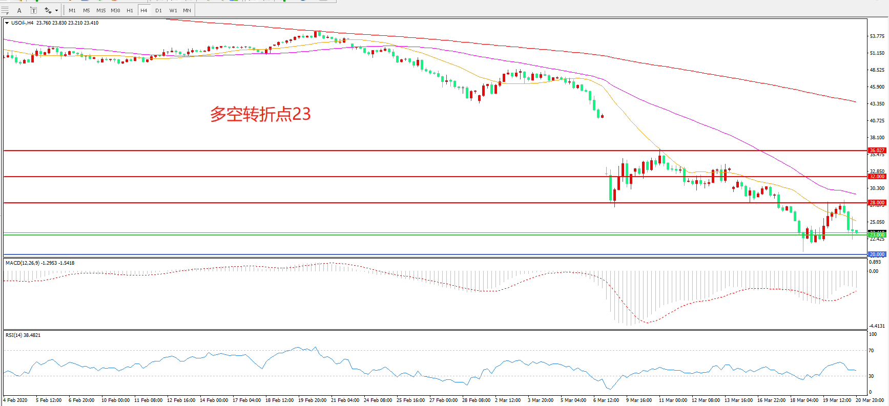 4小时图看,美油以23美元为支撑一度冲高,但整体表现依然低迷,均线系统仍呈空头排列,MACD绿柱增加,RSI指标走平,日内延续震荡概率较大。