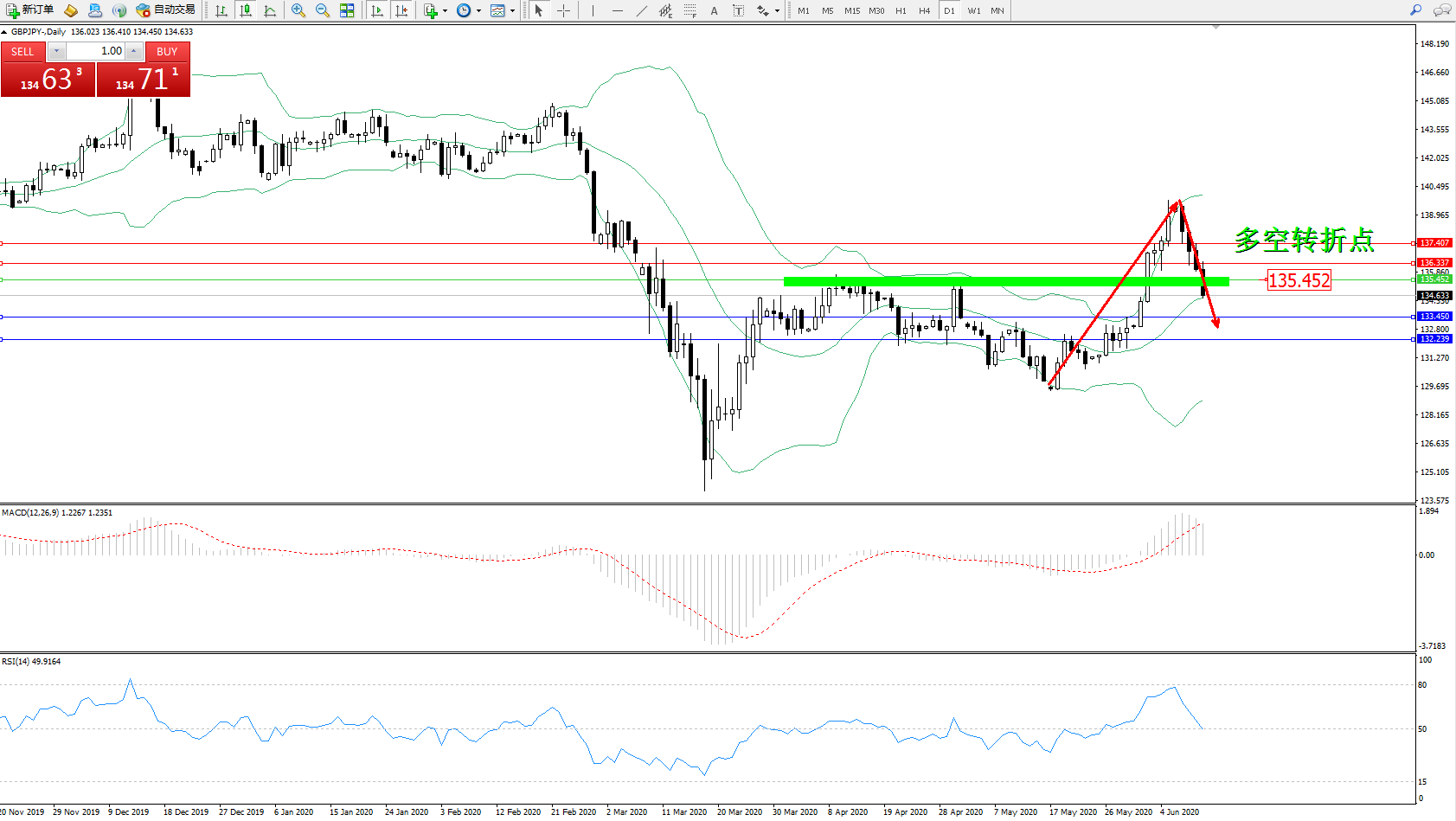 交易策略:135.452下方看跌,目标133.450、132.239