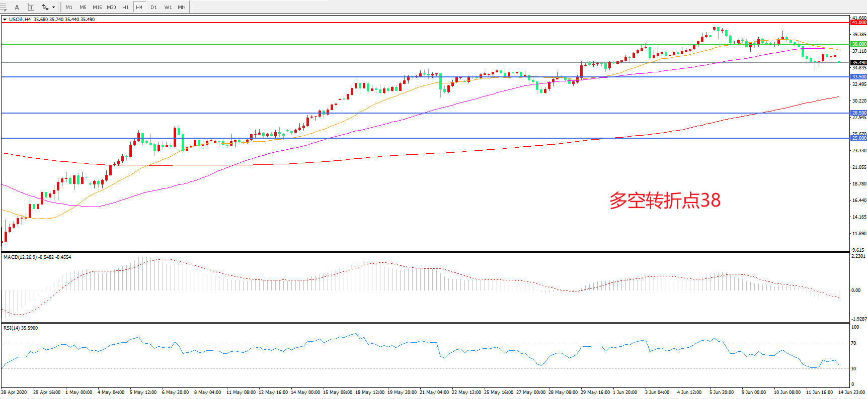 上周,在美联储警告新冠疫情可能会对经济造成长期损害之后,市场风险情绪恶化,油价终结六连涨的步伐,周一(6月15日)美国WTI原油跳空低开,截止发稿前收报35.54美元/桶。眼下油市面临的最大风险仍是疫情二次蔓延的风险,如果近期经济复苏的势头和疫情缓和的势头被证明是暂时的,那么油价将再次遭遇抛售。