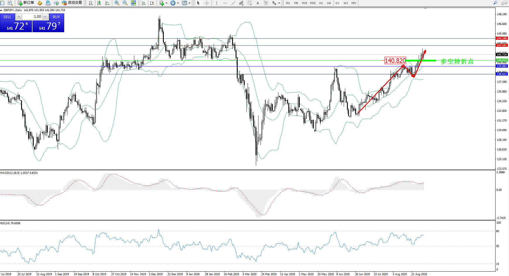 交易策略:140.820上方看涨,目标143.181、144.298