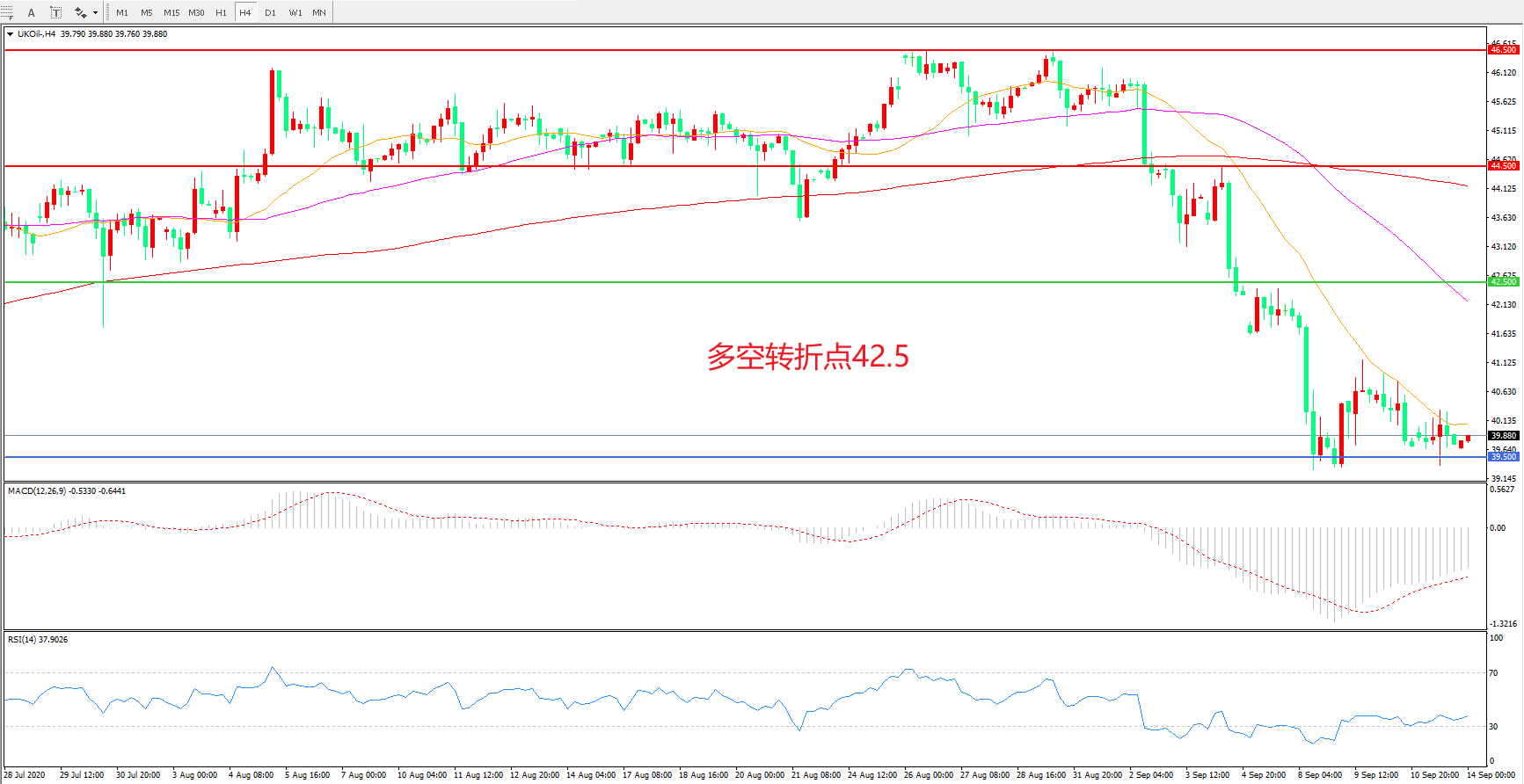 交易策略:   在42.50之下看跌,目标39.50      37.00