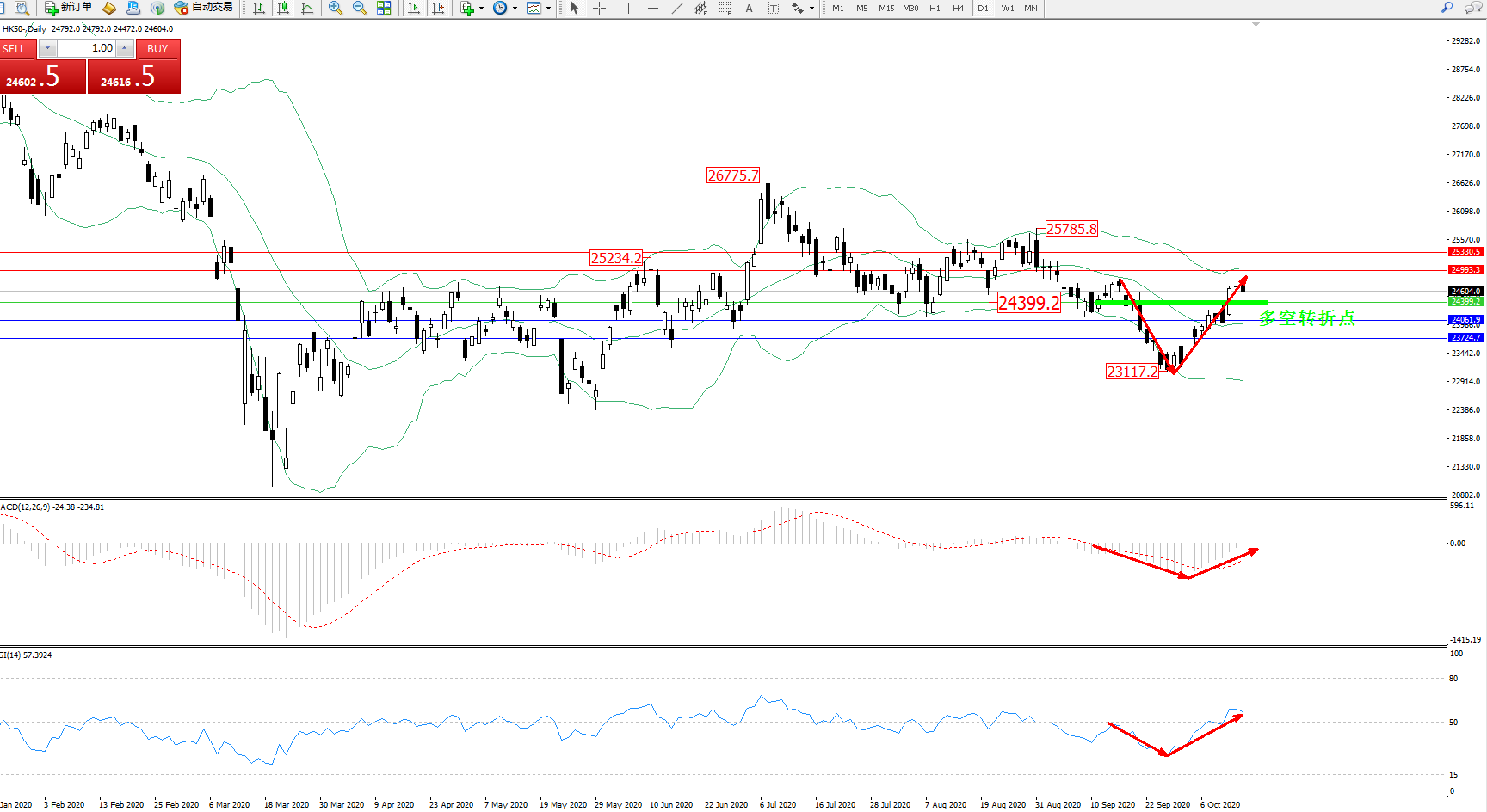 香港恒生指数10月14日(周三)收盘上涨17.41点,涨幅0.07%,报24667.09点;港股恒指高开低走呈弱势震荡态势,恒生科技指数涨0.92%。风电股再度强势,金风科技飙涨超22%创8个月新高;军工股大跌居前,中国恒大大跌17%表现最差;恒生科技股涨跌各半,权重股科技股涨势较好,腾讯升3%再创历史新高,小米涨2.4%,京东涨2.2%。今日南下资金净流入7.45亿港元,大市成交额放大至1543亿港元。据华尔街日报,美国强生公司希望未来几天内能够弄清楚是否可以恢复其新冠疫苗的试验。强生此前宣布,由于志愿者中出现不明病况,决定暂停其新冠疫苗的临床试验。目前正根据规定对病况进行研究。据报道,强生首席财务官约瑟夫·沃尔克表示,独立委员会目前正在研究导致试验不得不暂停的“不明病况”。他表示,试验有望只会暂停几天。强生目前尚不清楚志愿者是接受了实验性疫苗还是安慰剂。