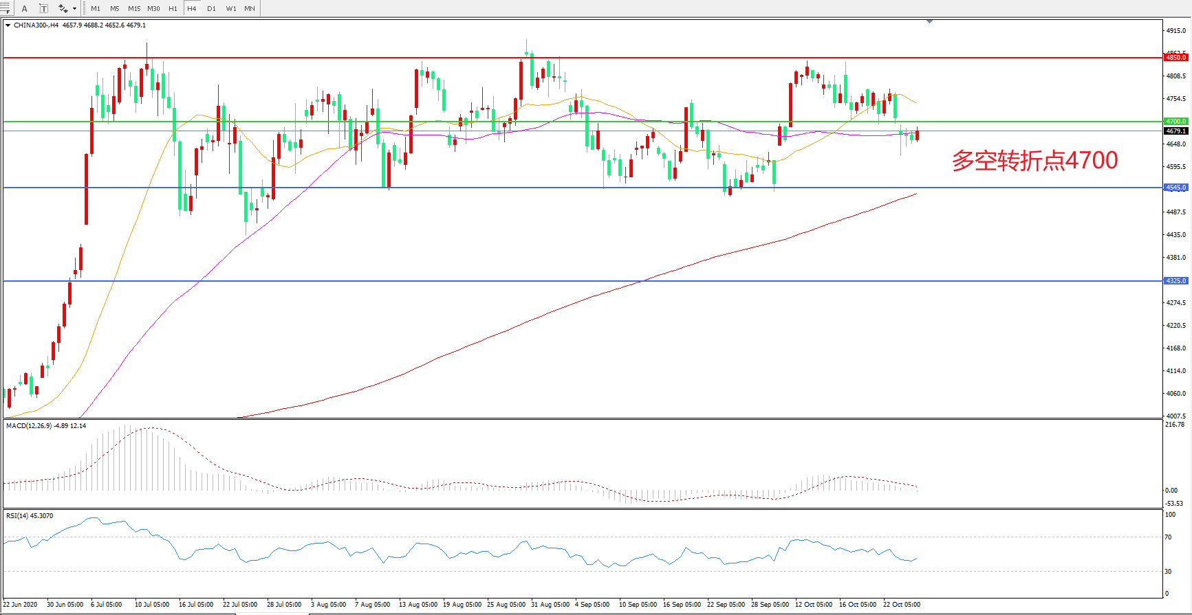 交易策略:在4700.00之下看跌,目标4545.00       4325.00