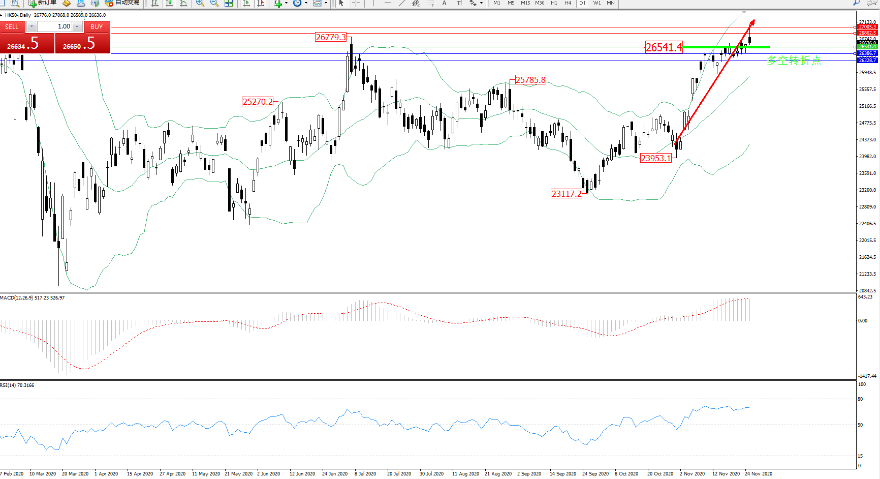香港恒生指数11月25日(周三)收盘上涨81.55点,涨幅0.31%,报26669.75点;港股高开低走,恒指早盘强势,午盘持续回落,科技股走低,致恒生科技指数大跌2.29%。大型科技股全部下挫,美团跌超3%,腾讯跌近2%,京东、网易、阿里均跌逾1%;黄金股尾盘跌幅扩大,体育用品股多数低迷,医疗保健股重挫,集中采购种类扩大。今日南下资金净流入22.93亿港元,大市成交额为1780.6亿港元。当前港股市场对资金的吸引力已开始体现,明年伴随基本面向好,“新经济”投资标的增加,港股估值仍有抬升空间。新冠疫苗有机会面世、环球及中国经济复苏、财政刺激及极低利率等持续对资产价格构成支持,但MSCI香港指数自三季度至今反弹逾10%,已经体现不少利多因素,估值水平不算吸引。当前港股远期市盈率略高于5年平均值,市净率则接近5年平均值。估计MSCI香港指数明年盈利增长强劲反弹21%,意味2019至2022年间每股盈利年增长预期5%至6%。但基于基本面缺乏亮点,限制了估值显著走高,港股明年预计将温和上涨8%至10%。