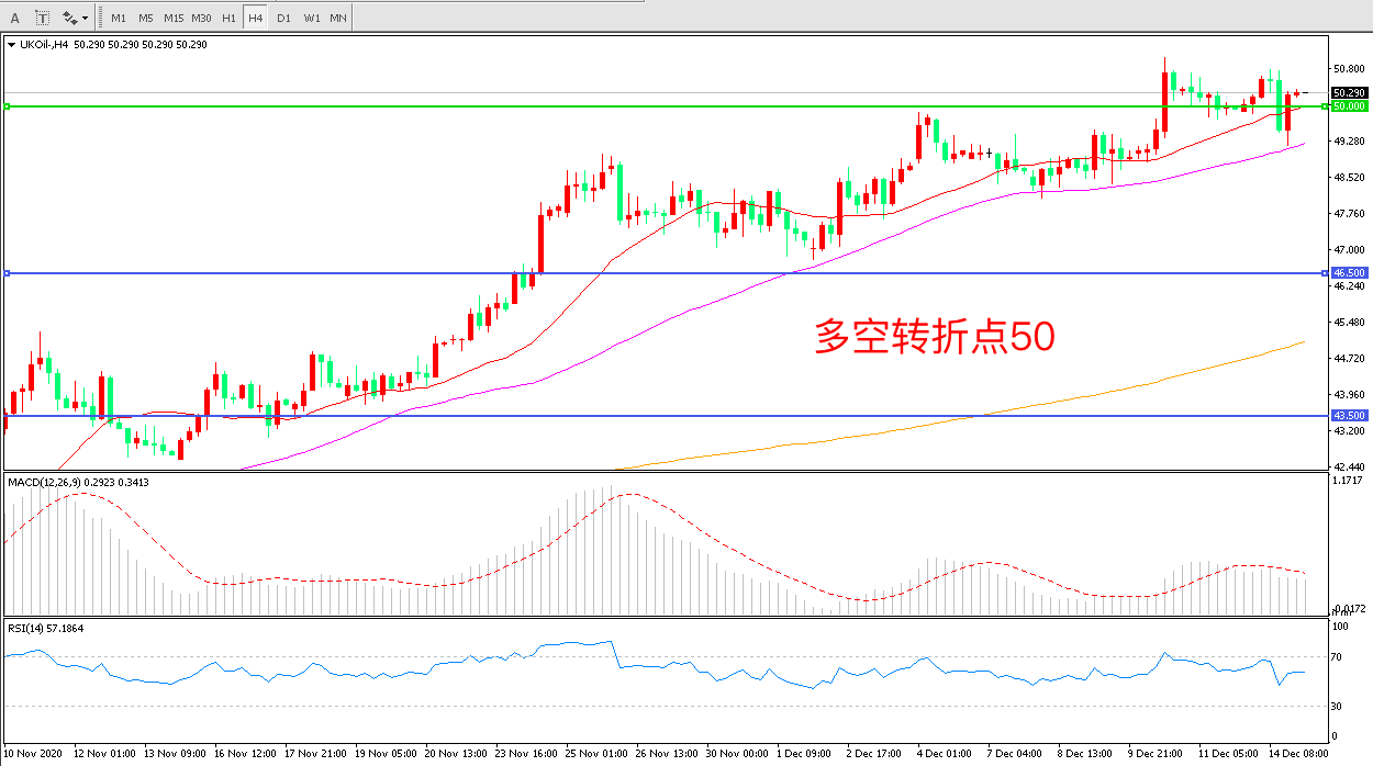 周一(12月14日),疫苗接种形势提振需求前景,油价涨超1%,但OPEC再度削减今明两年全球石油需求预期令市场情绪再度承压,布伦特原油延续高位震荡,收报50.29美元/桶,目前来看,原油多头的韧性依然比较强。