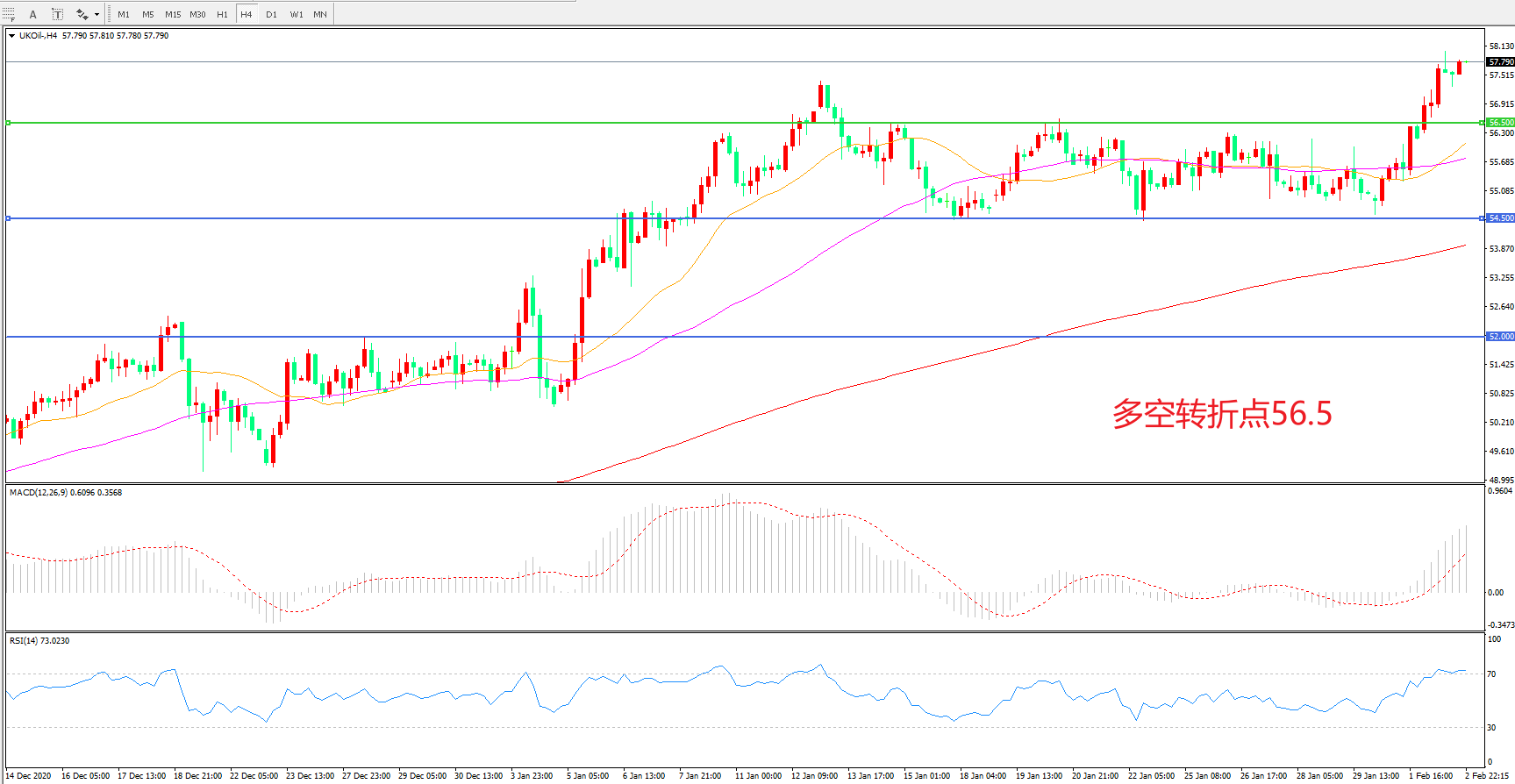 4小时图看,油价连续拉升,整体表现偏强,56.5阻力被快速突破,多头趋势正在形成,MACD红柱增加,RSI指标向上,日内延续上行概率较大。