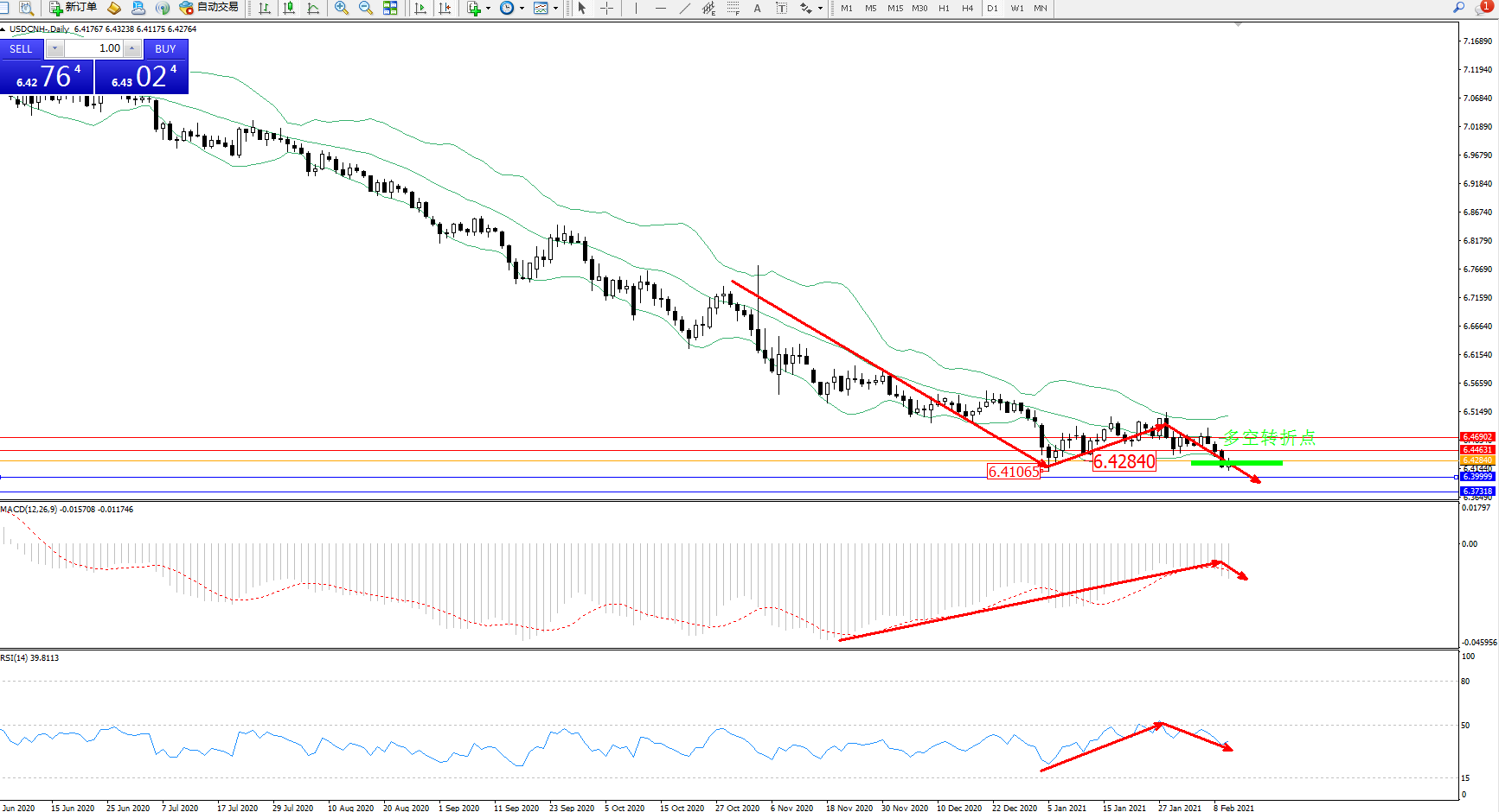 交易策略:6.42840下方看跌,目标6.39999、6.37318