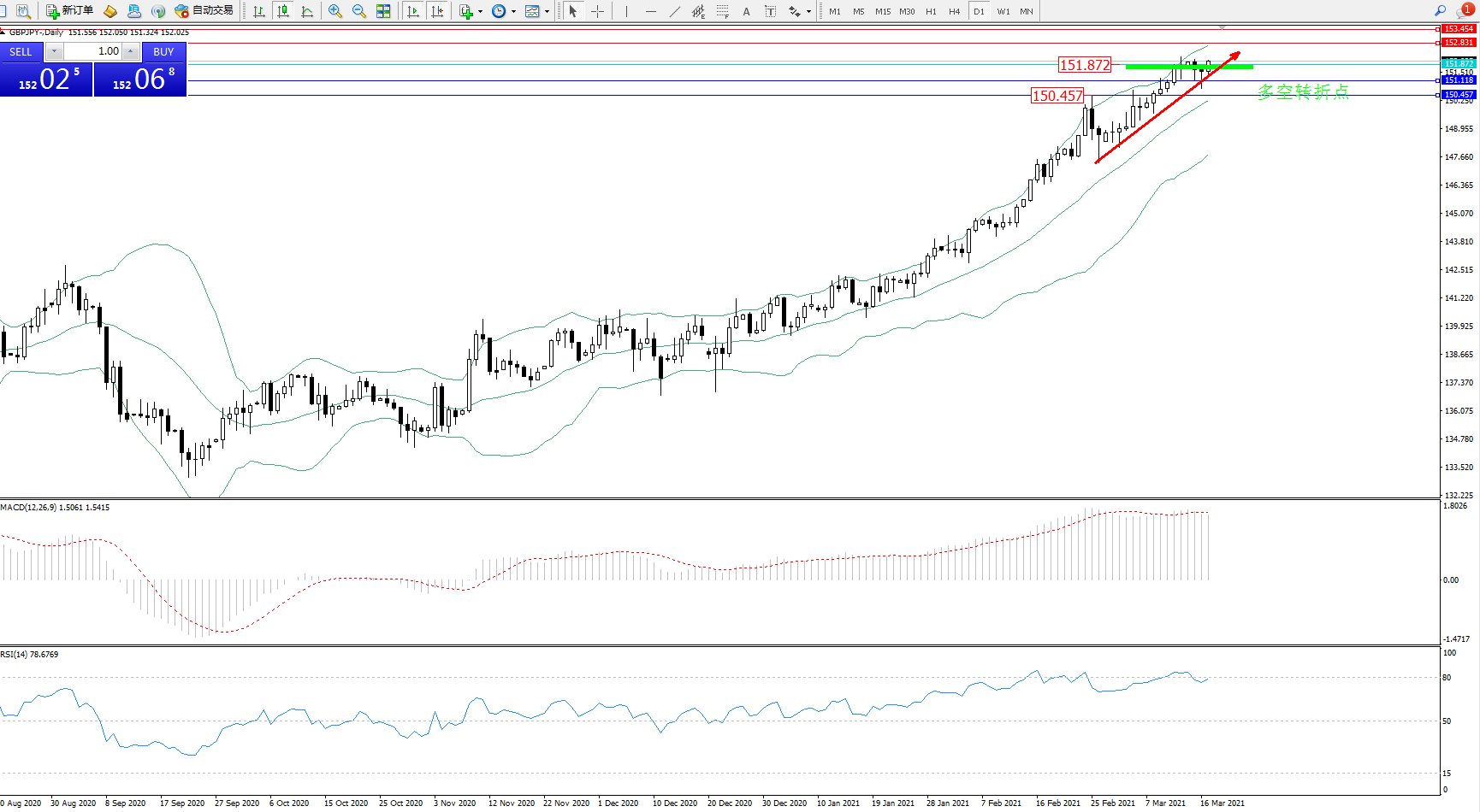 备选策略:151.872下方看跌,目标151.118、150.457