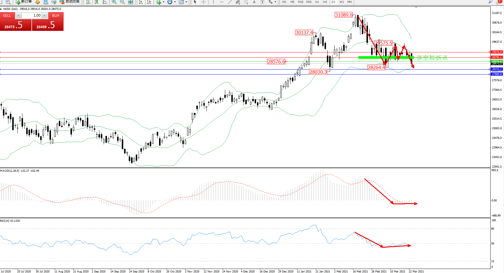 技术点评:空头动力维持在布林带指标探底中下轨区间持续震荡,空头动力有向下移动态势,之前低位28264位置近在咫尺,破位在即,布林带指标呈收口走势持续中,关注中下轨区街道,MACD指标处于0轴线下方空头区域维持整理平移中,RSI指标处于50均衡线下方维持震荡有下移迹象;