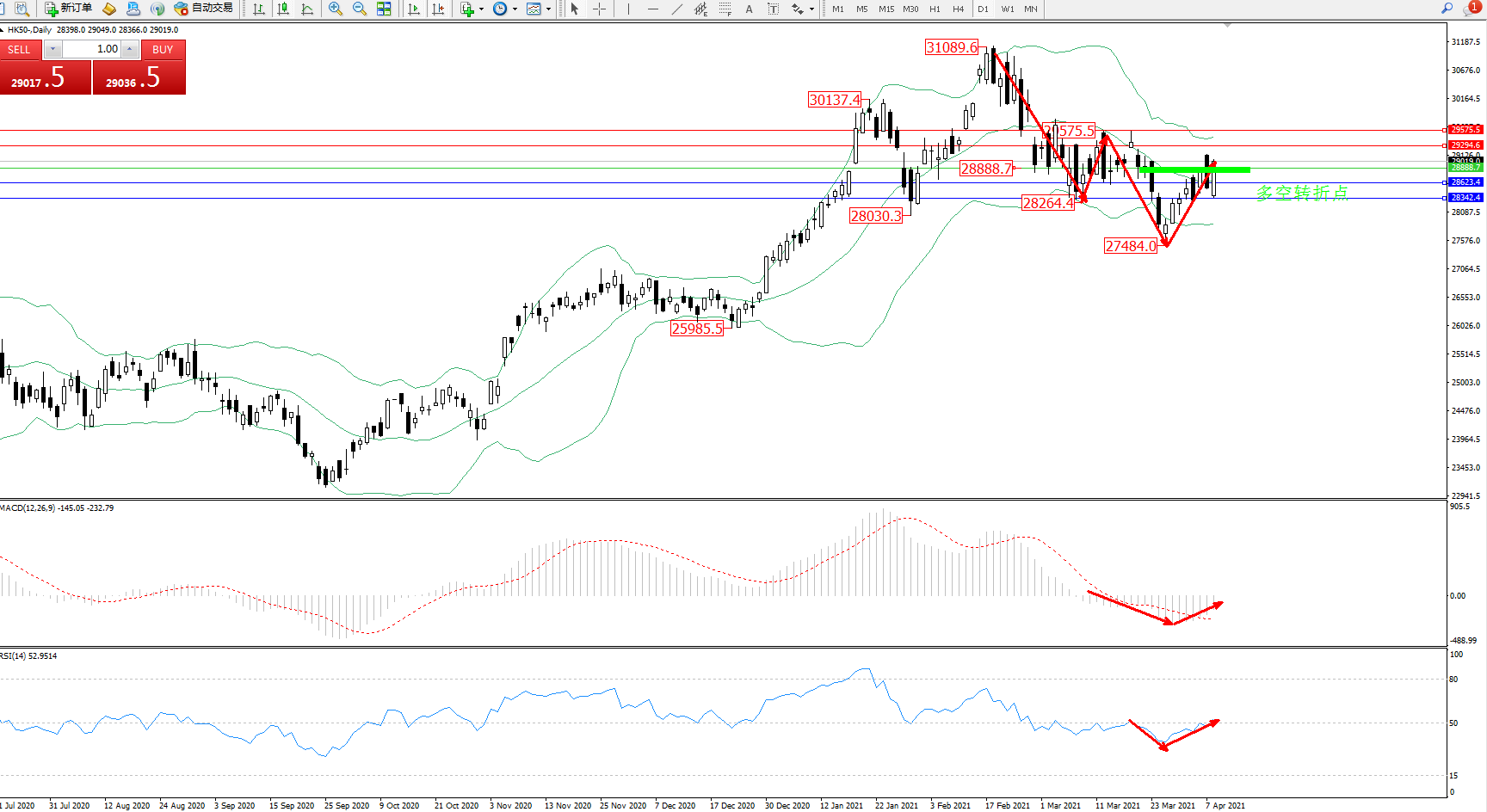 恒指HK50 ——日K线图显示: