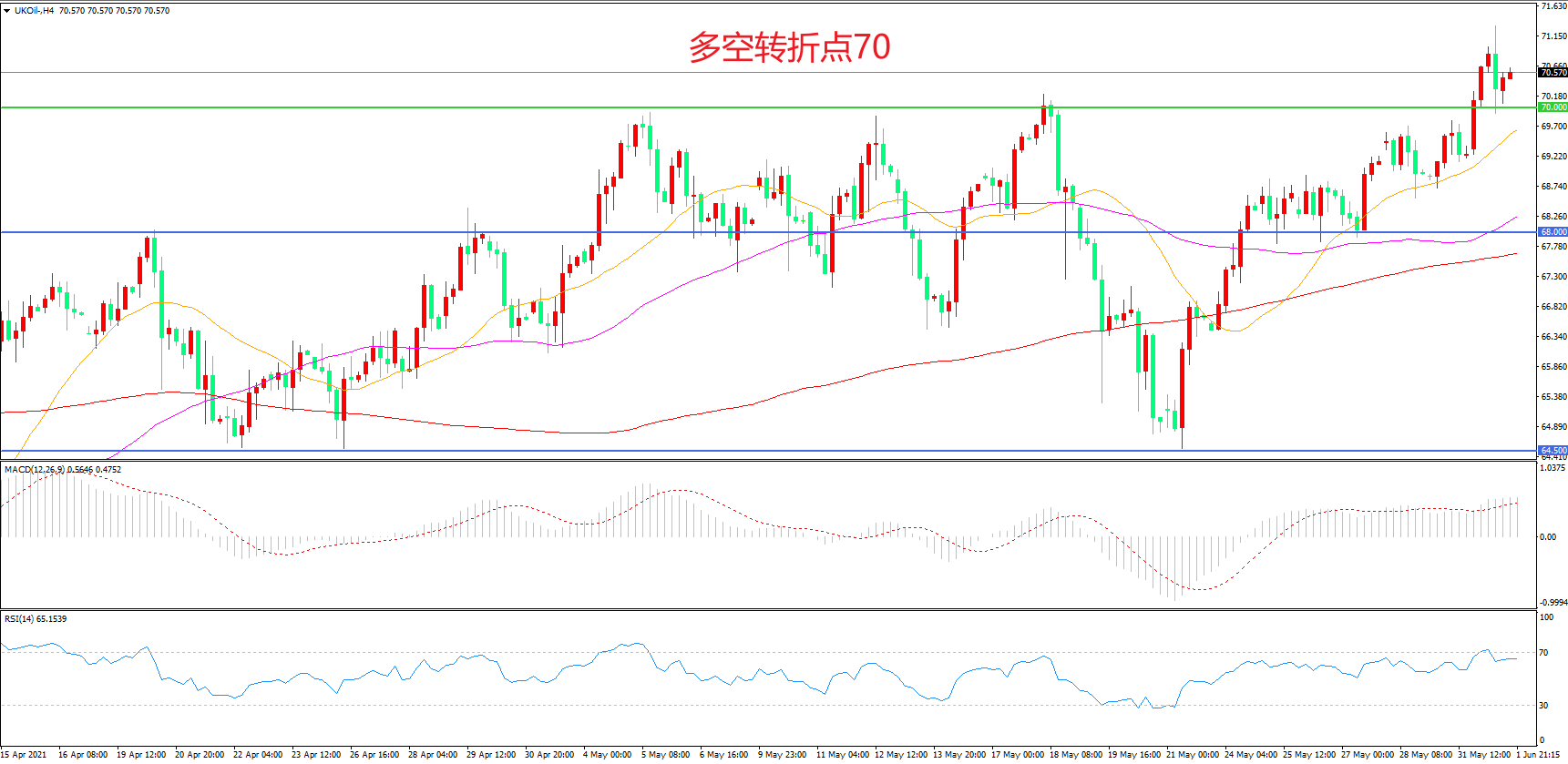 4小时图看,油价长阳拉升,突破前期整理区间,短期表现较为强势,21周期均线拐头向上,70美元成为下方支撑,MACD红柱增加,RSI指标走平,日内震荡上行概率较大。