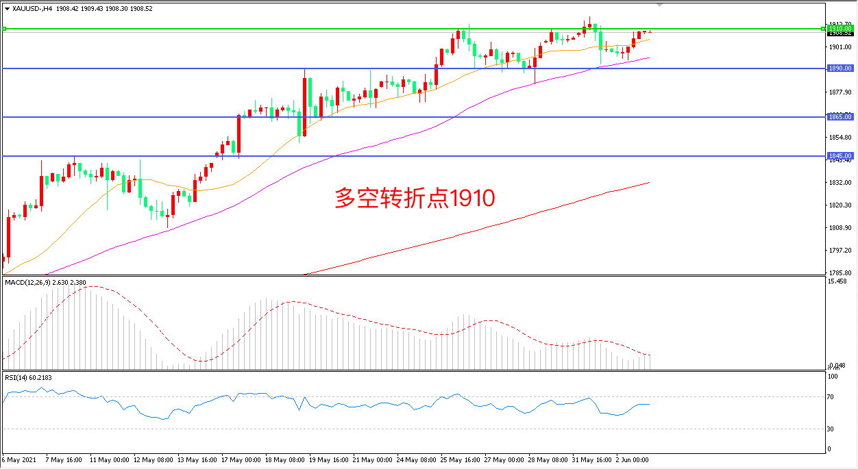 周三(6月2日),尽管10年期美债收益率回落,但美元指数扩大隔夜反弹势头,对金价走势形成打压,现货黄金续徘徊在1900美元关口,收报1908.97美元/盎司。美国5月制造业活动回升提振市场风险偏好,限制了避险黄金近期的涨势。目前,市场关注点集中在今晚的ADP就业数据和周五的非农就业报告上。