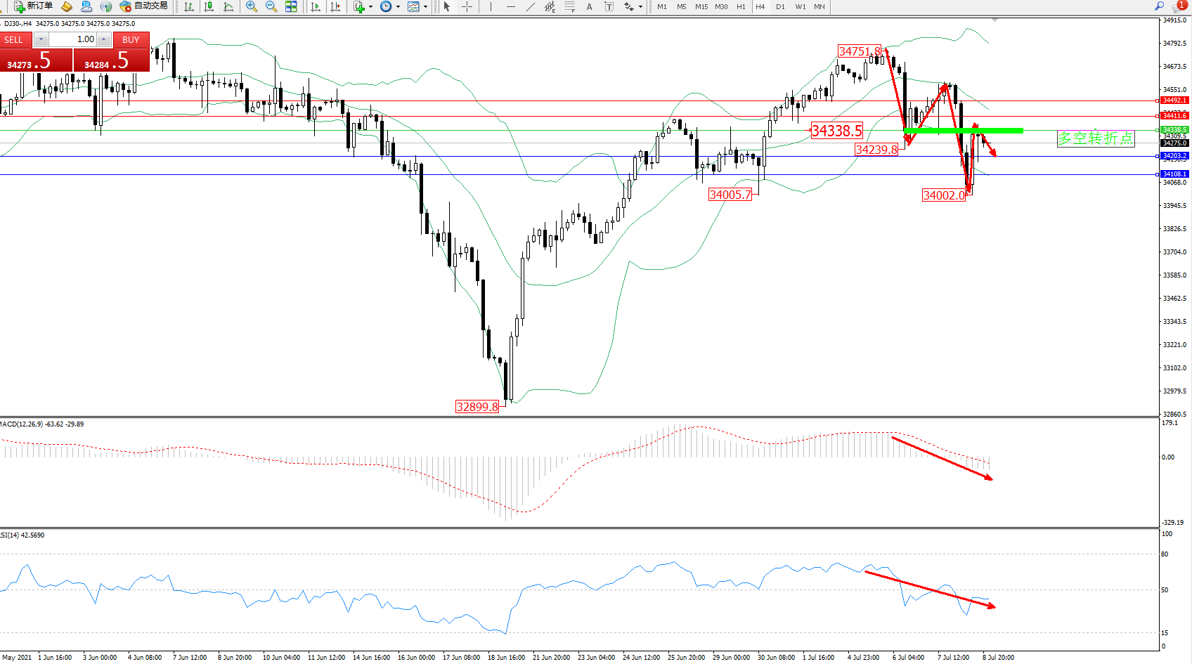 道琼斯指数DJ30——4小时K线图显示: