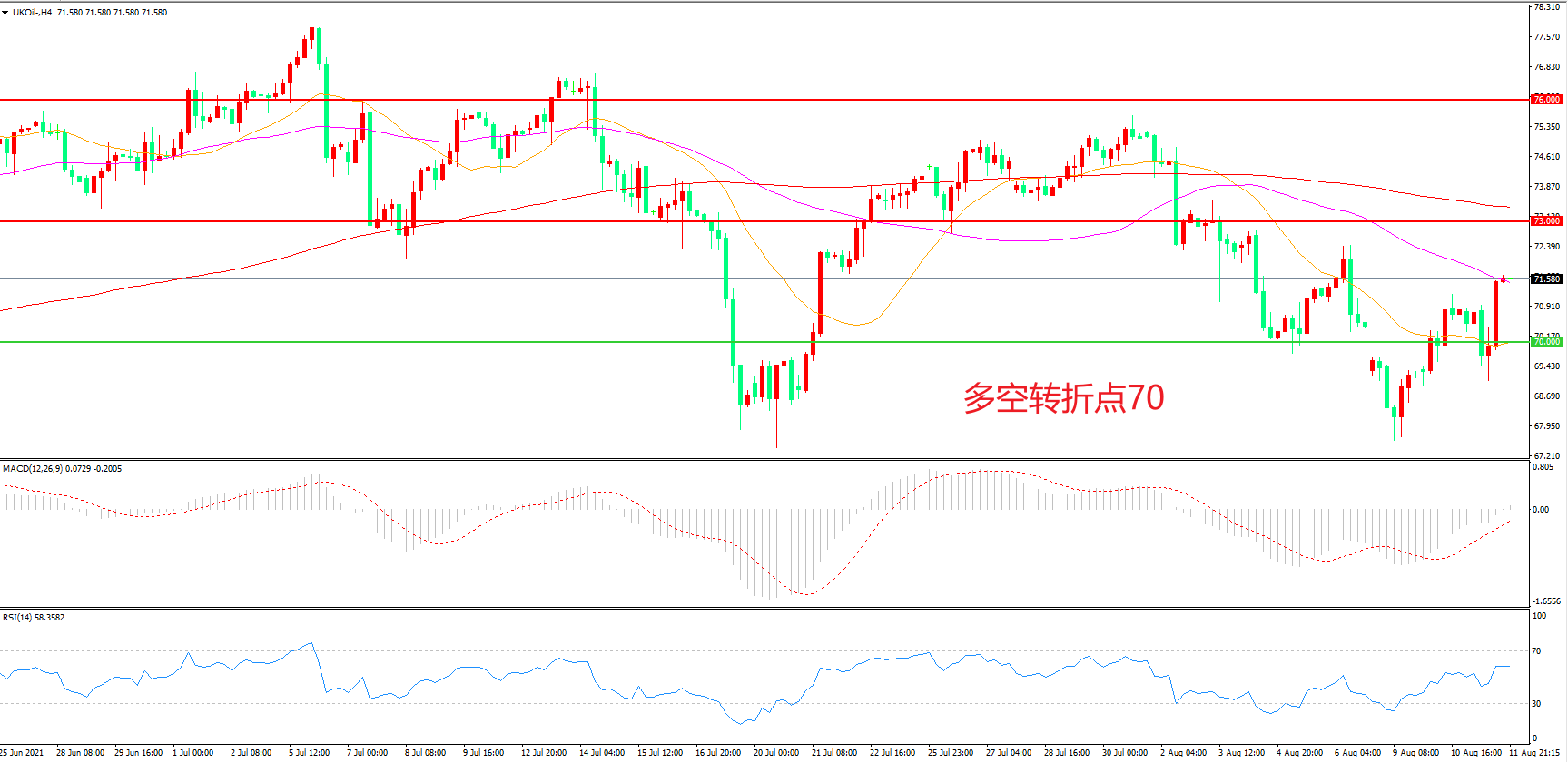 4小时图看,油价回踩70美元附近后再度反弹,短线行情回暖,55周期均线成为短期阻力,MACD绿柱缩短,RSI指标走平,油价震荡上行概率较大。