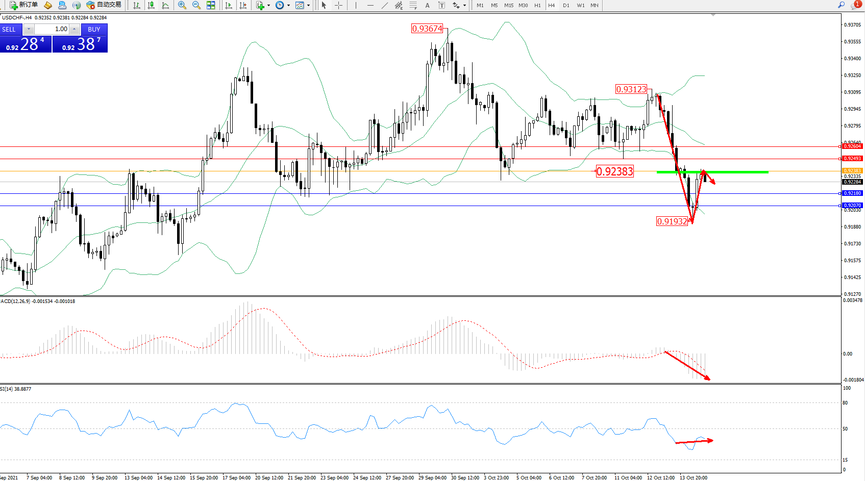 交易策略:0.92383下方看跌,目标0.92180、0.92070