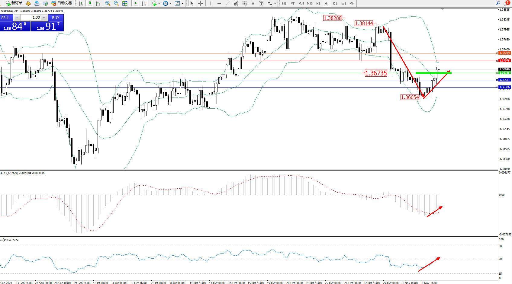 交易策略:1.36735上方看涨,目标1.37076、1.37289