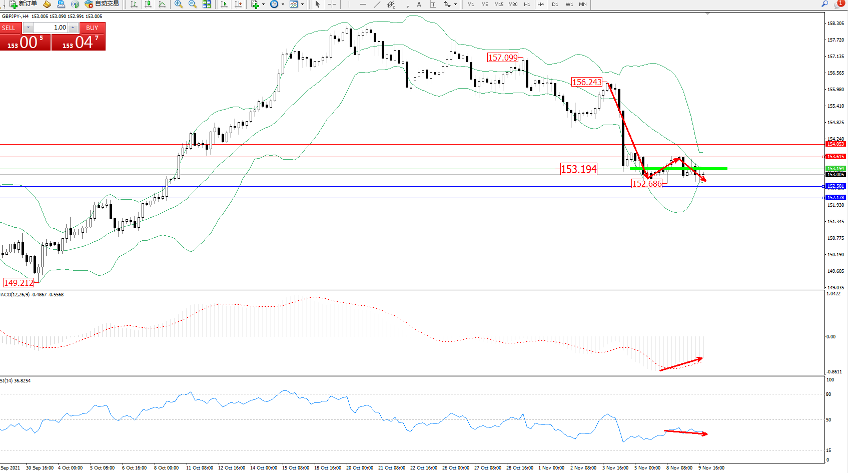备选策略:153.194上方看涨,目标153.615、154.053