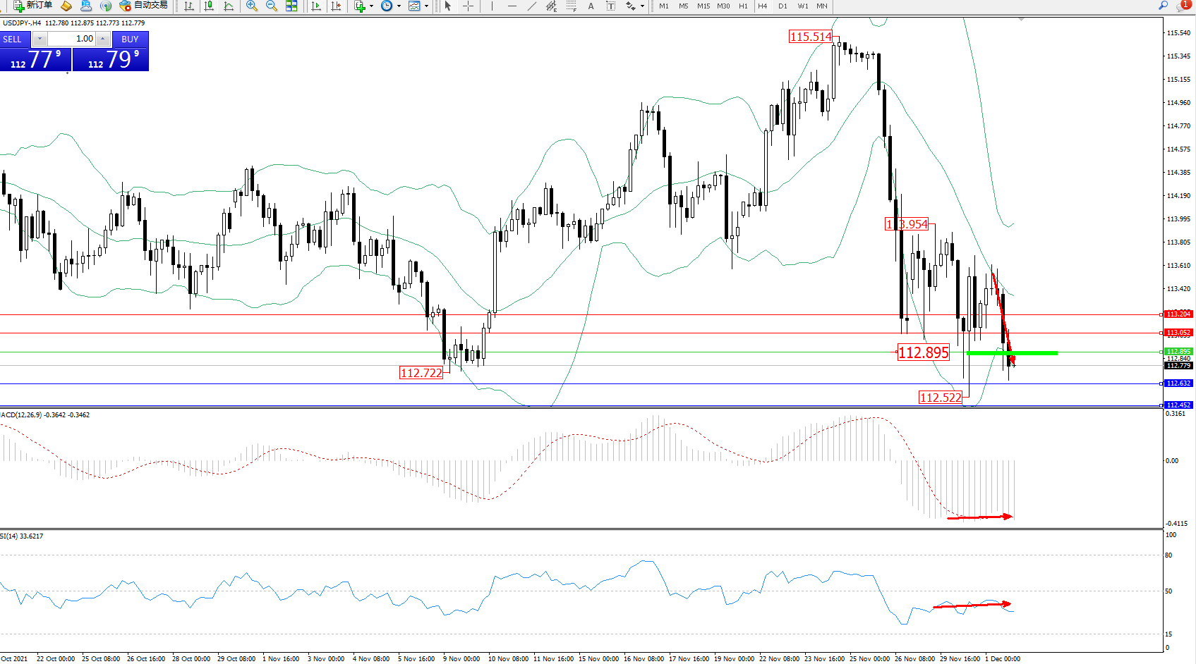 交易策略:112.895下方看跌,目标112.632、112.452
