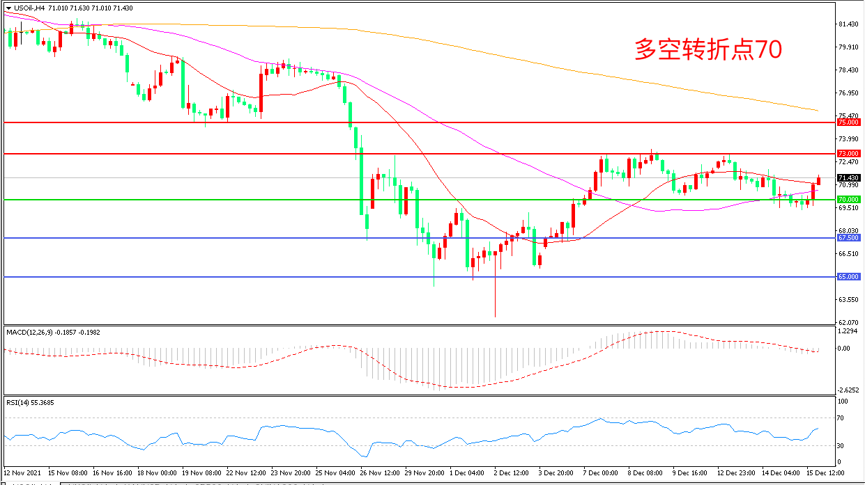 4小时图看,油价短线探底回升,区间震荡形态明显,73美元成为上方阻力,70美元成为多空分水岭, MACD红柱缩短,RSI指标走平,日内延续震荡概率较大。