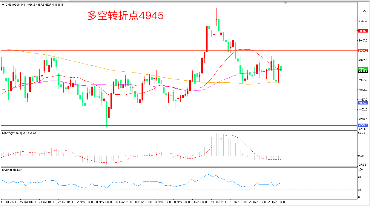 4小时图看,沪深300长阴下破后大幅反弹,短期走势有所回暖,4945一线被首富,200均线成为下方支撑, MACD绿柱缩短,RSI指标走平,日内延续震荡概率较大。