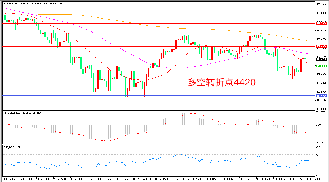 周二(2月15日),普京表态同意继续循着外交道路努力后,俄罗斯将从乌克兰边境撤离部分部队,俄乌地缘政治紧张局势明显降温,标普500大幅反弹,收报4456.75点。除了俄乌地缘政治局势紧张令投资者不安,对美联储今年激进加息的担忧也令风险资产承压,重点关注日内即将发布的美联储会议纪要。