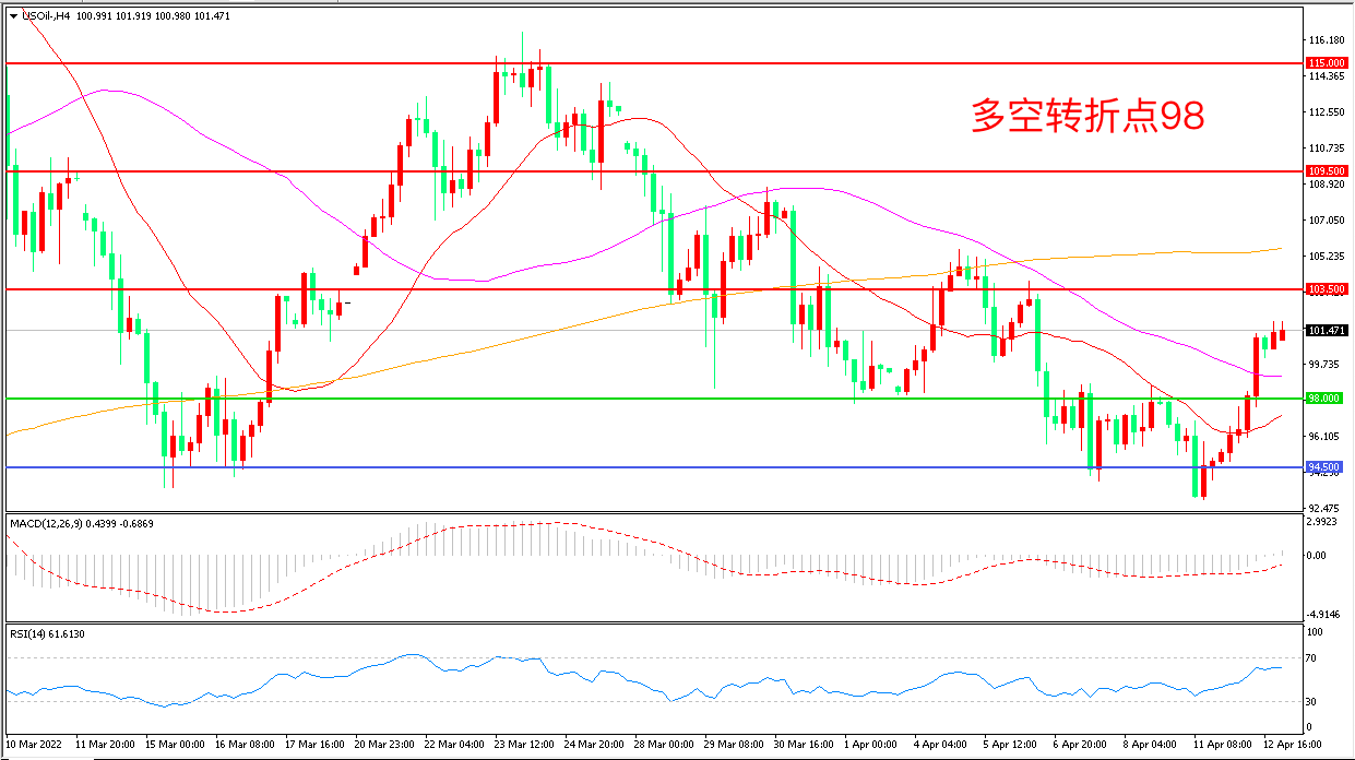 4小时图看,油价回踩94.5美元后大幅拉升,短期走势回暖,均线系统走平,MACD红柱增加,RSI指标走平,日内震荡上行概率较大。