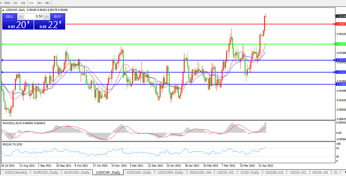 美元指数加速上行,美元兑瑞郎直线拉升
