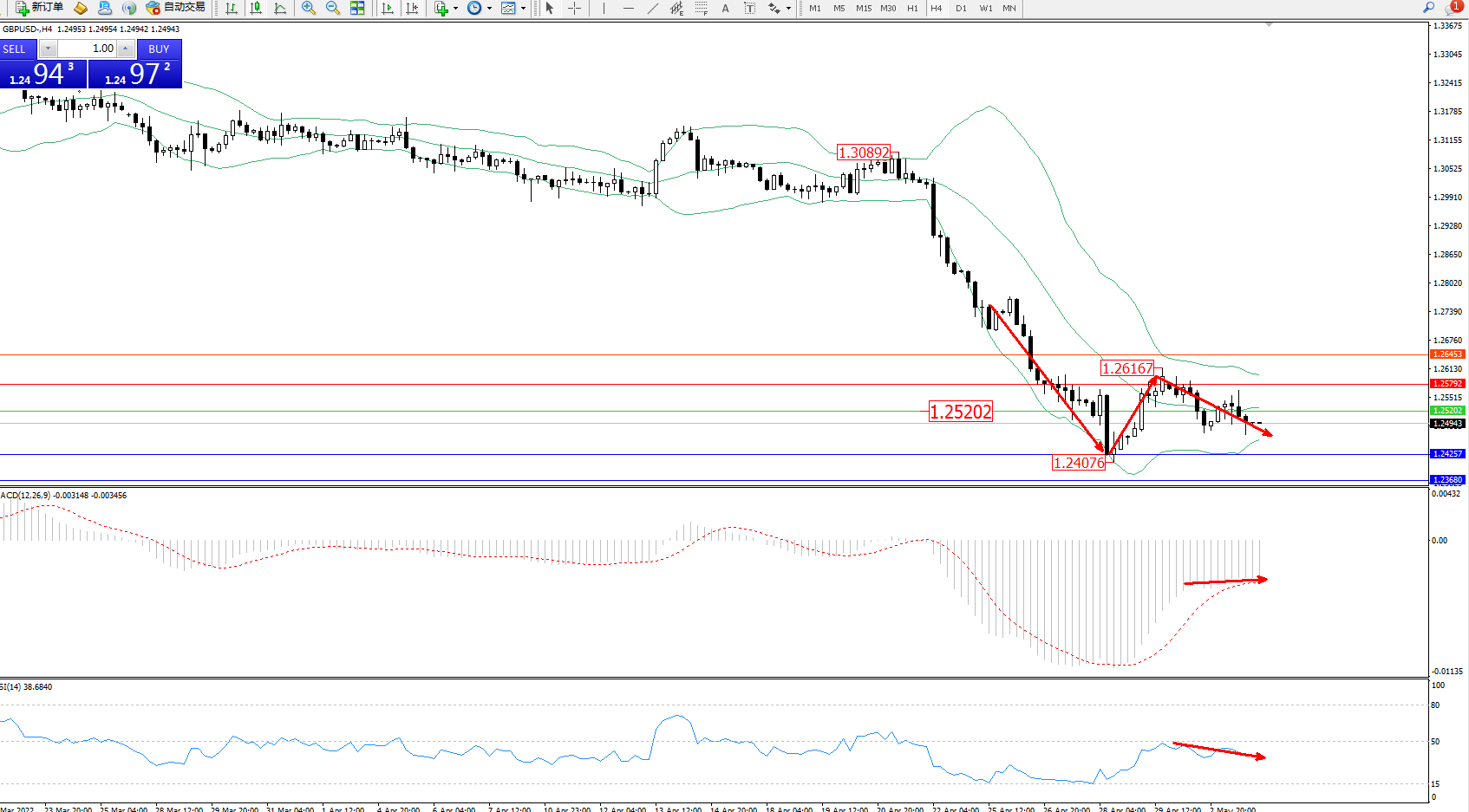 交易策略:1.25202下方看跌,目标1.24257、1.23680
