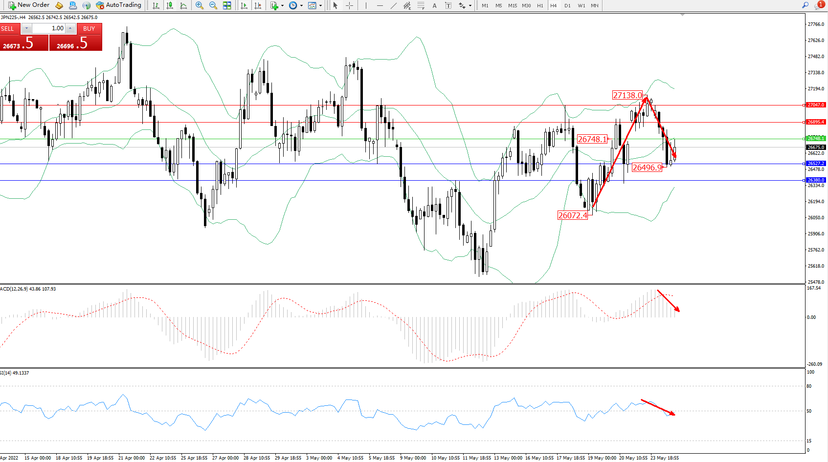 日经225指数5月24日(周二)收盘下跌216.52点,跌幅0.80%,报26785.00点。日本通胀率将在今年最后三个季度保持在央行2%的目标水平之上。日本本季度和下一季度不含生鲜食品的消费者价格将同比上涨2.1%,今年最后三个月将上涨2.2%。预期较上次调查数据的向上修正反映出通胀继续高于分析师的预期。