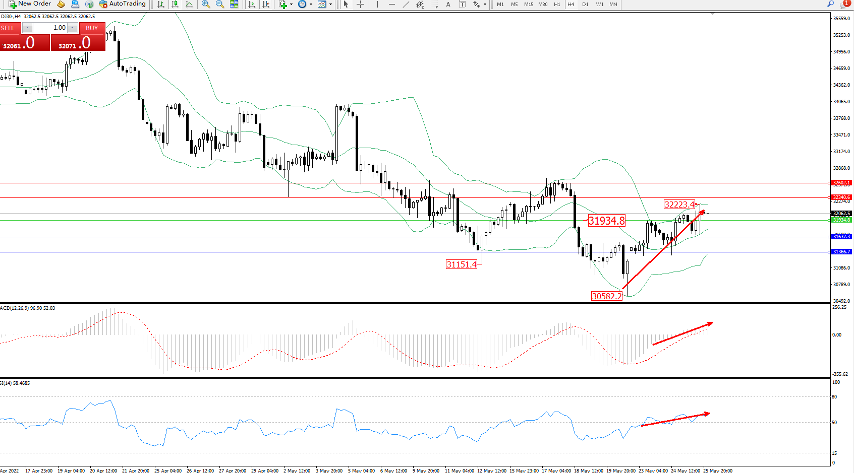 道琼斯指数5月25日(周三)收盘上涨191.66点,涨幅0.60%,报32120.28点;美股收盘,三大股指震荡走高,道指初收涨200点,美联储周三发布的5月3-4日会议纪要显示,“多数与会者认为,在接下来的两次会议上,每次升息50个基点可能是合适的。