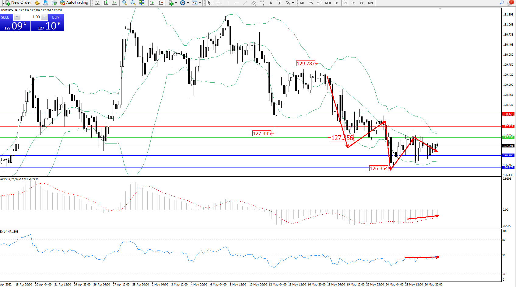 技术点评:空头动力延续布林带指标通道中下轨区间持续震荡下行,低位抵达126.354附近节点后开始维持在中下轨区间窄幅震荡平移,布林带指标呈收口走势持续中,MACD指标处于0轴线下方空头区域维持弱势缓慢上移,RSI指标处于50均衡线下侧维持窄幅整理;
